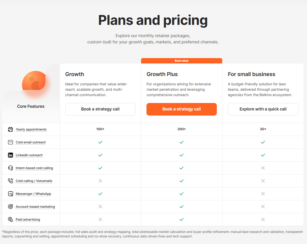 Belkins is known for offering shorter commitments and flexible engagement models, including outcome-based pricing in some scenarios. This makes Belkins appealing for: